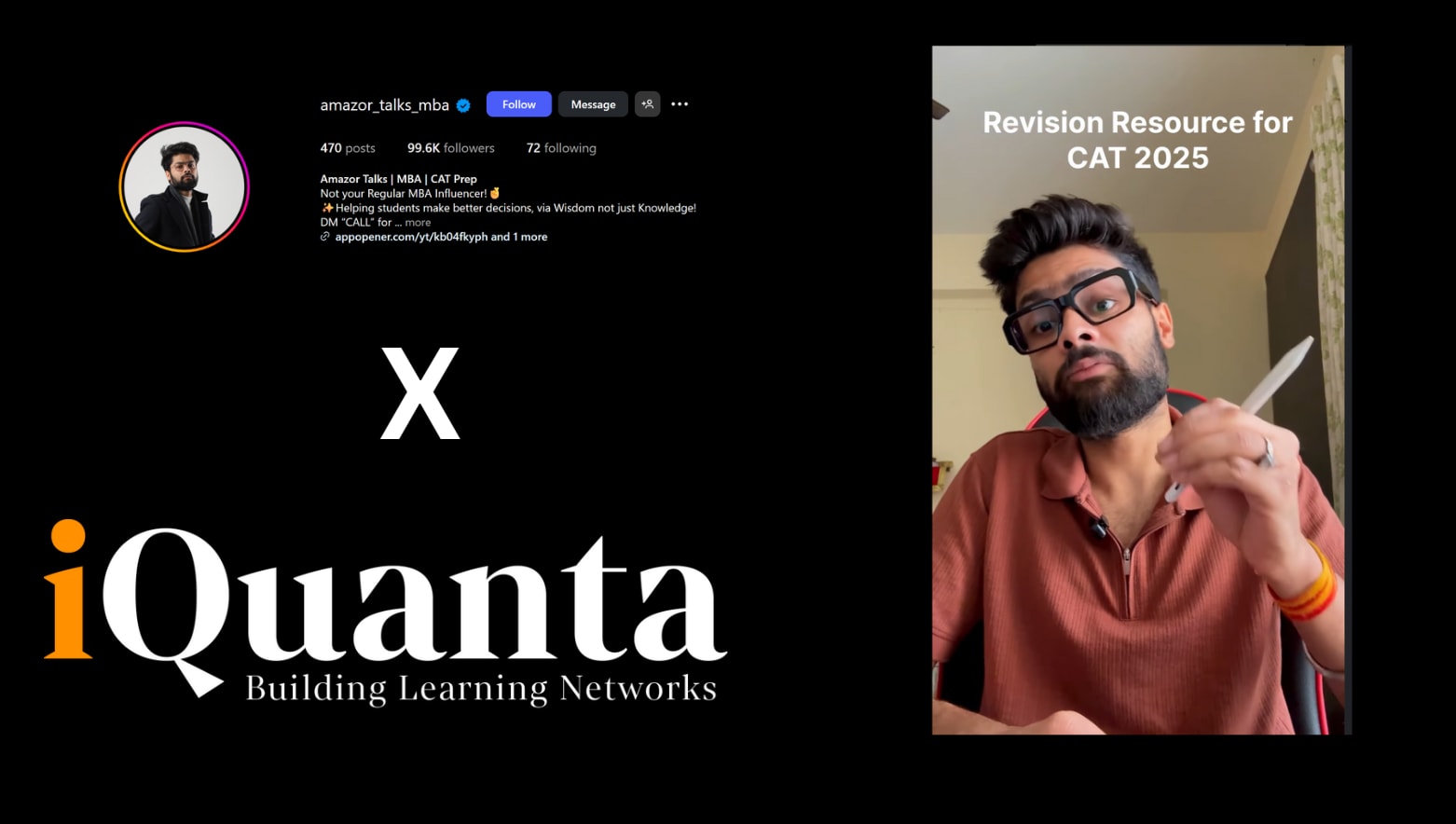 Executed and managed a high-intent influencer marketing campaign on Instagram to promote iQuanta’s “Revision Tool” for CAT 2025 aspirants. The campaign’s focus was to build product familiarity, drive measurable engagement, and convert awareness into trial signups within the 20-day pre-CAT period.