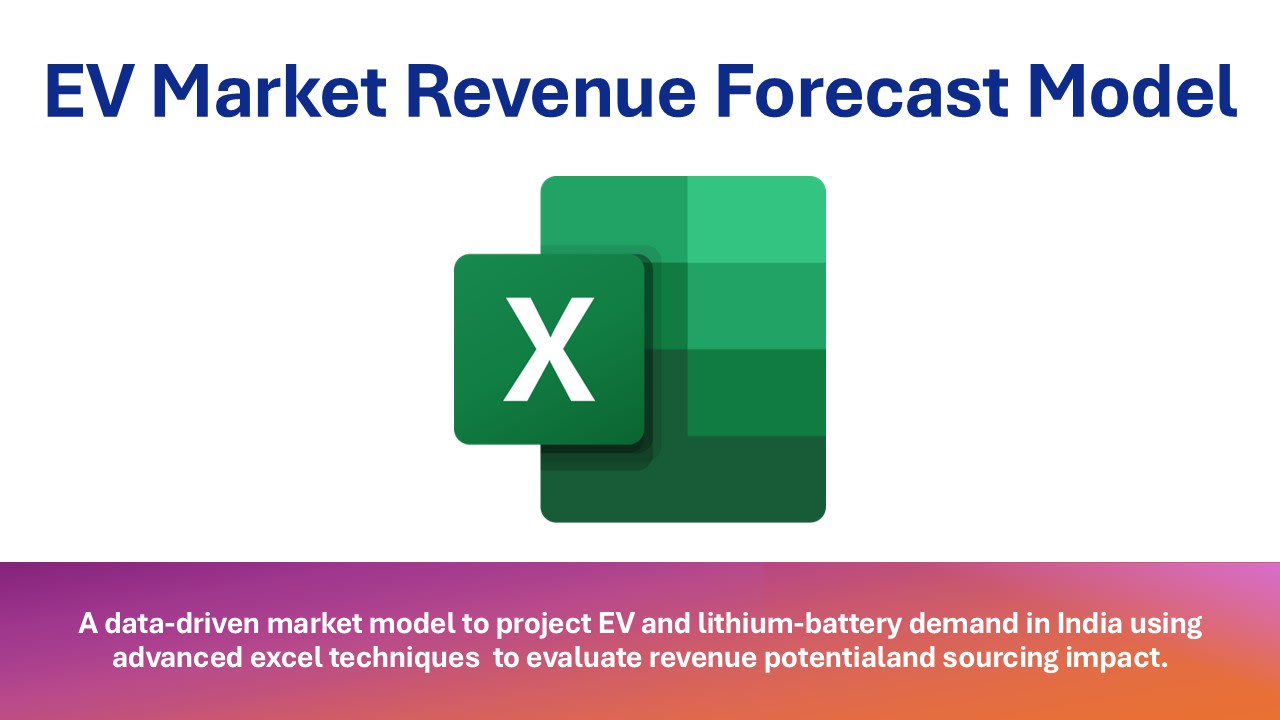 The objective of this project was to build a data-driven market forecasting model to project EV and lithium-battery demand in India and assess future revenue potential and sourcing impact. The project involved conducting market sizing analysis, defining cost assumptions, and creating projections for FY25 and FY30 using structured financial modeling approaches. I used advanced Excel techniques such as scenario modeling, formula-based forecasting, and data structuring to estimate demand trends and evaluate business implications. The model enabled a clear understanding of market growth drivers, supply considerations, and long-term revenue opportunities. This was an independent analytical project completed to strengthen my skills in market research, financial modeling, and data-driven decision analysis.