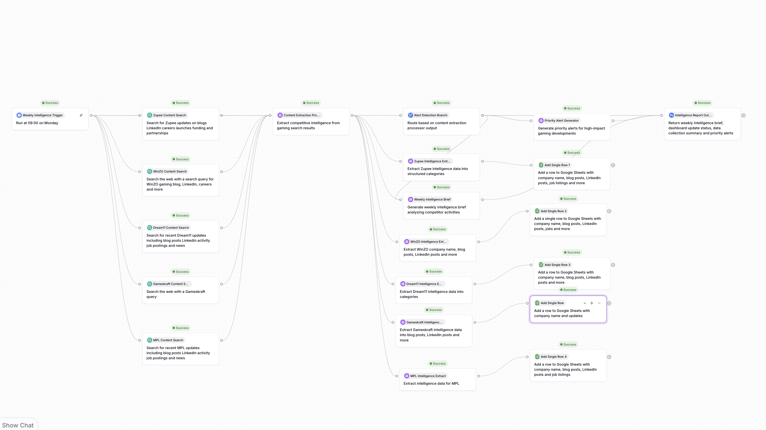 Weekly Trigger → Company Search Nodes (WinZO, MPL, Dream11, Gameskraft, Zupee) → Content Extraction Processor → Alert Detection → Google Sheets + Email Report.