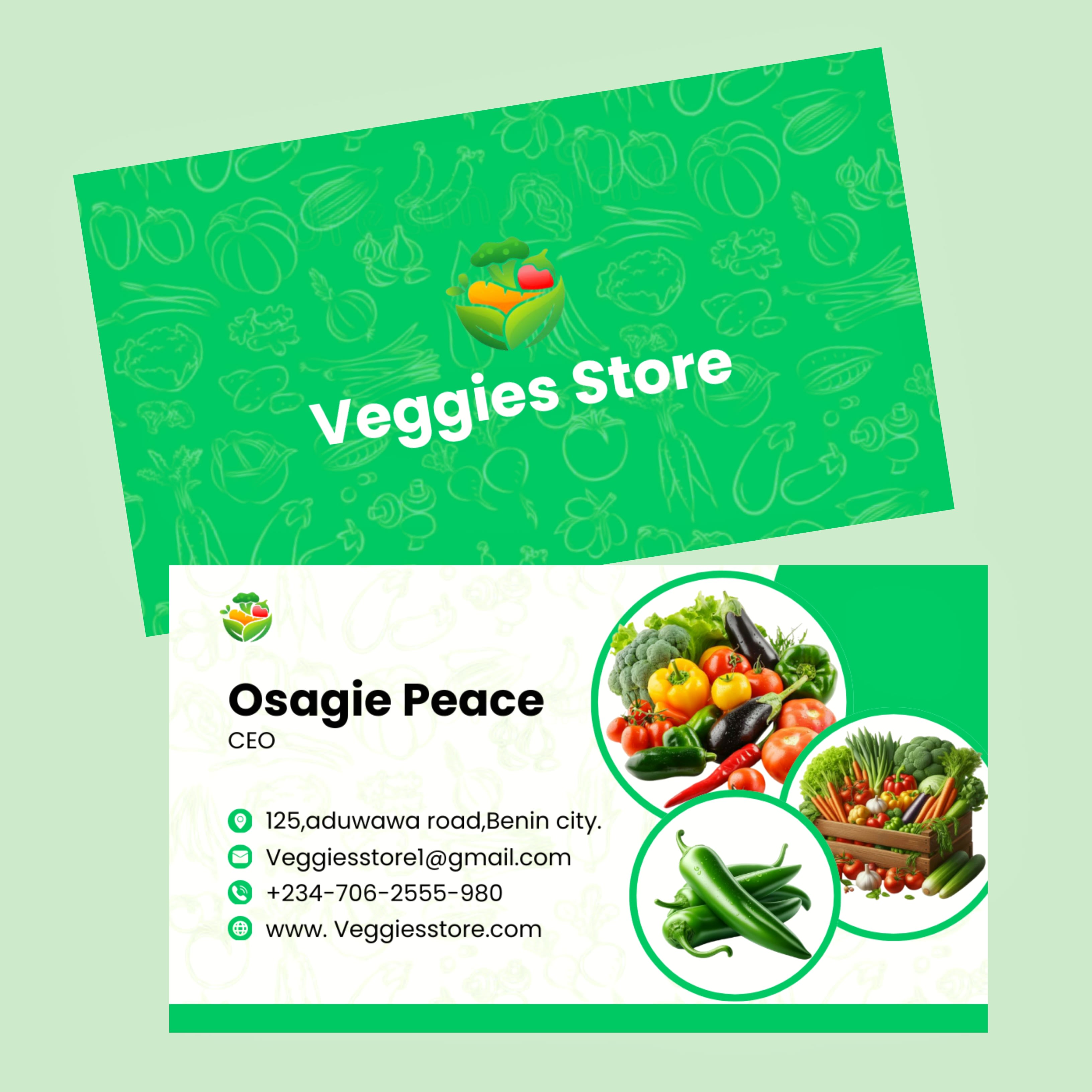 This Business Card was created for Veggies Store as a part of their branding revamp.The goal was to create a modern and beautiful design that carries both their details and samples of their products while still maintaining simplicity. It took a lot of sketches and experimenting colors to arrive at this shade of green that is more relatable to farm produce, speaks the brand tone and still maintains quality.I am very intentional about any design project I work on in order to make sure my clients get their money's worth.I am available for design gigs,hire me now.