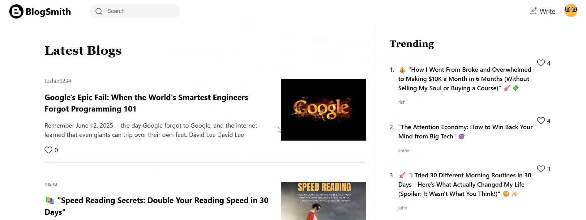 BlogSmith is a full-stack blogging platform built with modern web technologies. It supports secure user authentication, image-rich blogging, and seamless user experiences. Users can write, update, like, and delete posts, all while enjoying persistent sessions and secure access.