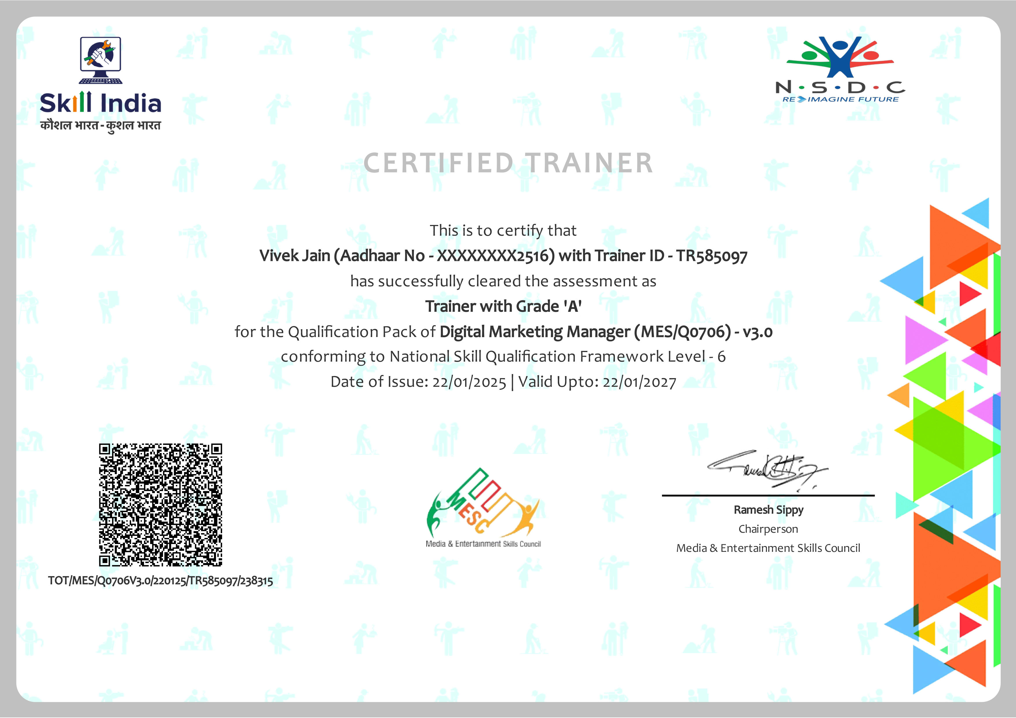 Certified Trainer for the Digital Marketing Manager qualification under the National Skill Qualification Framework (NSQF Level 6). This certification validates expertise in digital marketing strategy, online advertising, analytics, and industry-standard tools, along with the capability to train and mentor learners in professional digital marketing practices aligned with national skill development standards.