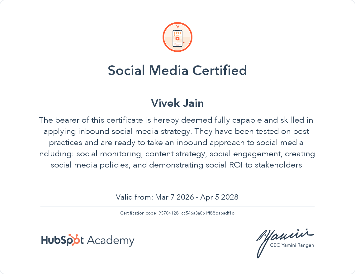 Earned the Social Media Marketing Certification demonstrating the ability to build and execute social media strategies. This certification validates expertise in social media content planning, audience engagement, social monitoring, brand communication, and measuring social ROI.