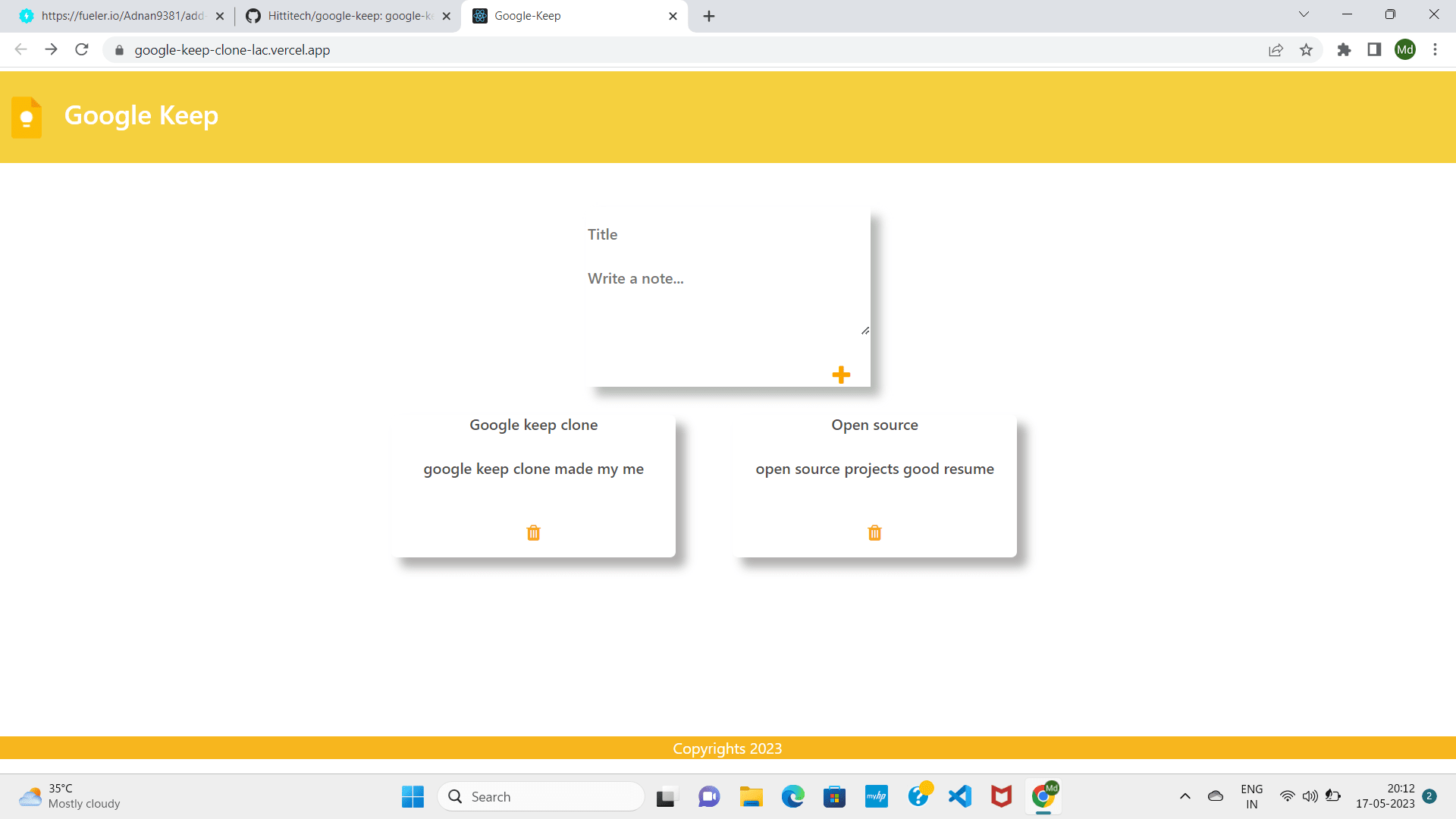 This is a Google-keep-clone . Built with Reactjs and learned about components and many more react concepts and using font awesome icons . we can create cards and delete them with this clone