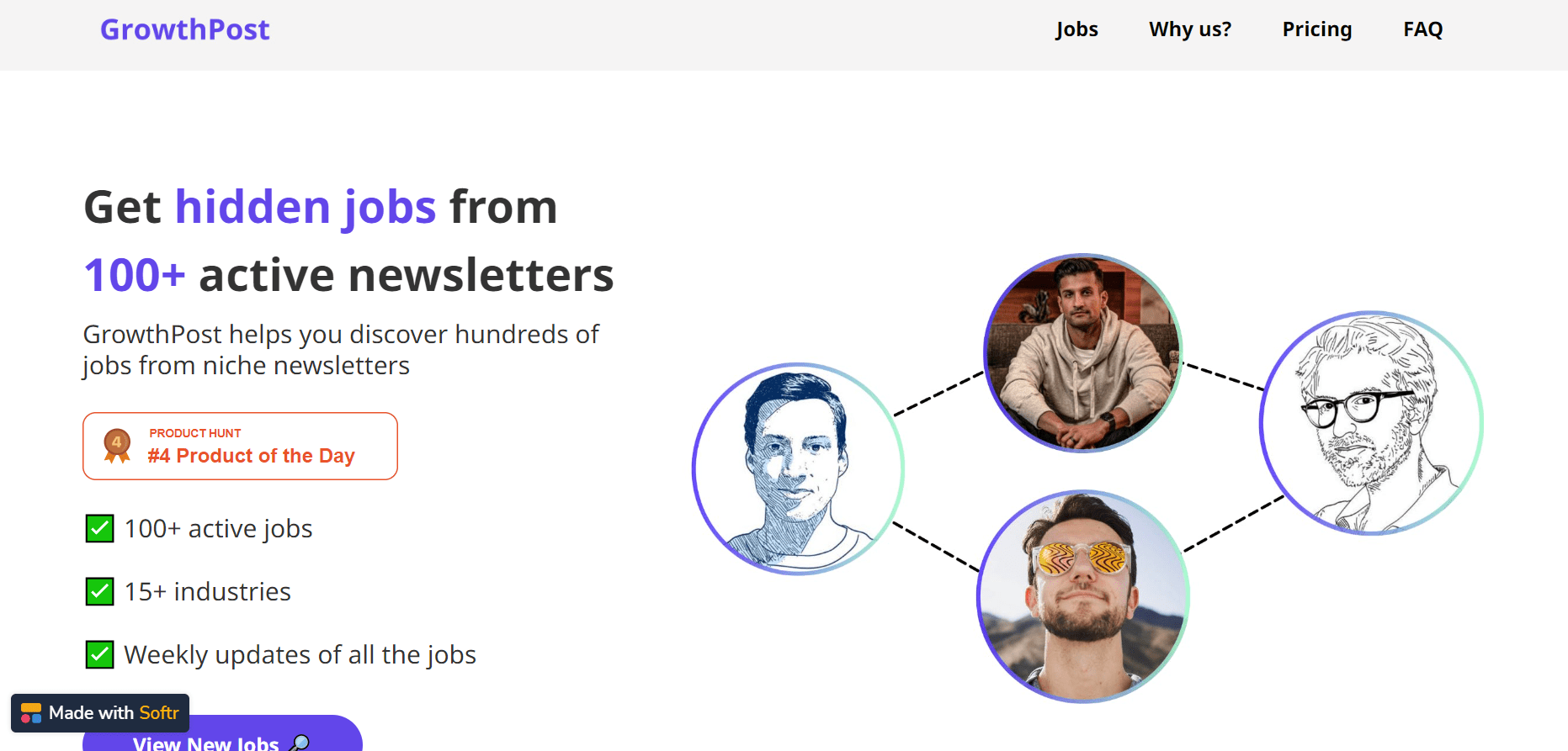 GrowthPost helps you discover 100+ jobs from niche newsletters written by top Entrepreneurs, Investors from the likes of Sahil Bloom, Julian Shapiro, Greg Isenberg, Lenny, and many more. GrowthPost does all tedious work & sends you weekly updates of new jobs.
