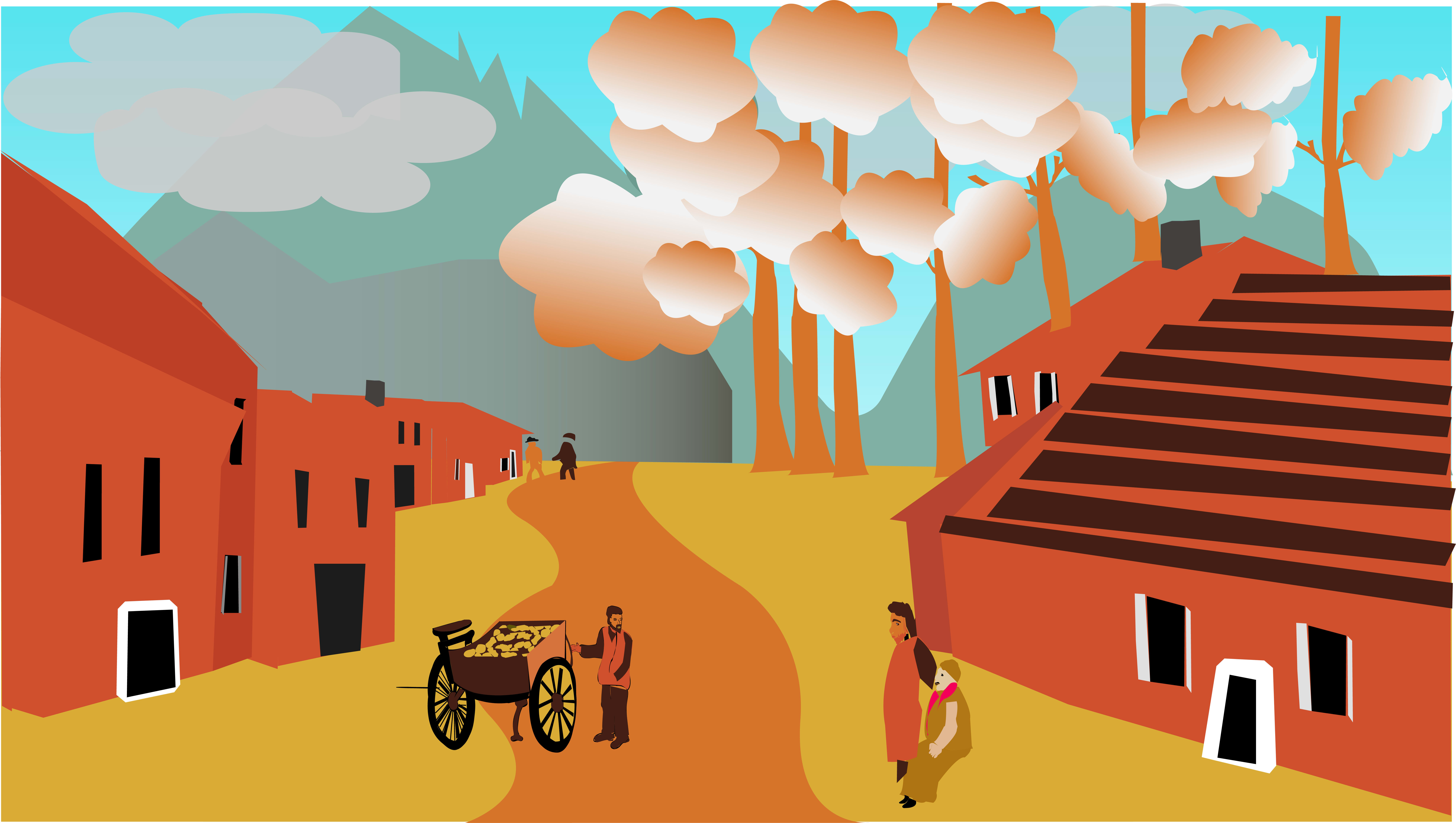 The village illustration captures the essence of a serene and idyllic countryside community. Nestled amidst rolling green hills, the village exudes a sense of tranquility and simplicity. Quaint cottages with thatched roofs and colorful gardens dot the landscape, their chimneys billowing gentle plumes of smoke. Narrow cobblestone streets wind their way through the village, lined with charming shops and cozy cafes. A central village square serves as a gathering place for residents, adorned with a picturesque fountain and surrounded by ancient trees. The air is filled with the aroma of freshly baked bread from the local bakery, and the sound of laughter and friendly chatter can be heard as villagers go about their daily lives. In the distance, a meandering river glistens under the golden rays of the sun, adding to the village's scenic beauty. The village illustration invites you to step into a world untouched by the hustle and bustle of modern life, where time slows down and the simple pleasures of community, nature, and a slower pace are cherished.