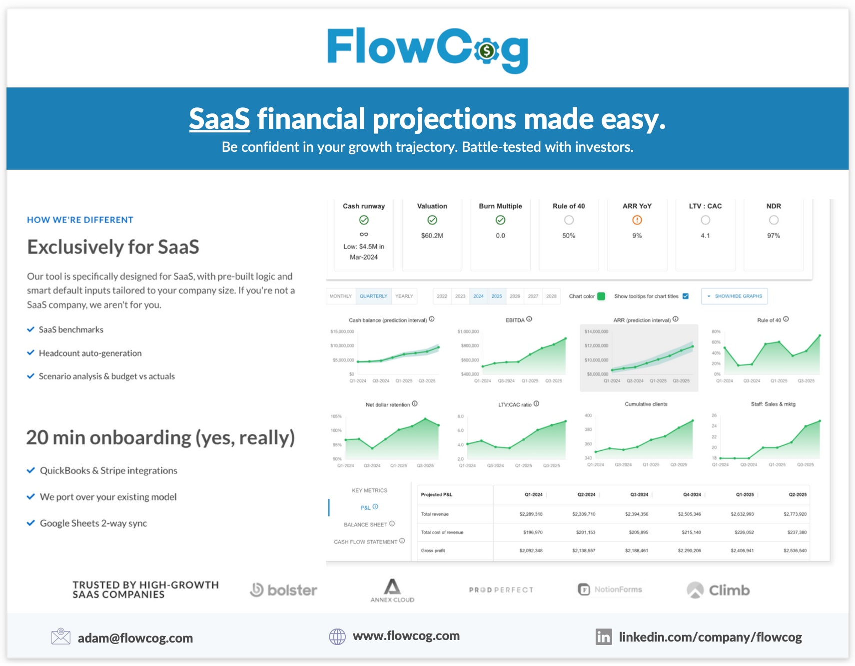 FlowCog's pre-built SaaS financial models save you time and hassle. Raise your next round with confidence.