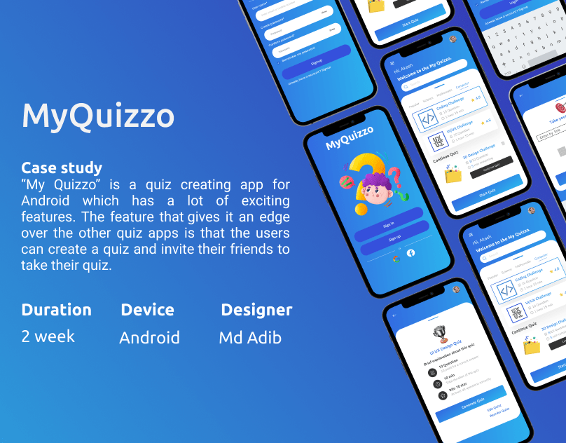 “My Quizzo” is a quiz creating app for android which has a lot of exciting features. The feature that gives it an edge over the other quiz apps is that the users can create a quiz and invite their friends to take their quiz.