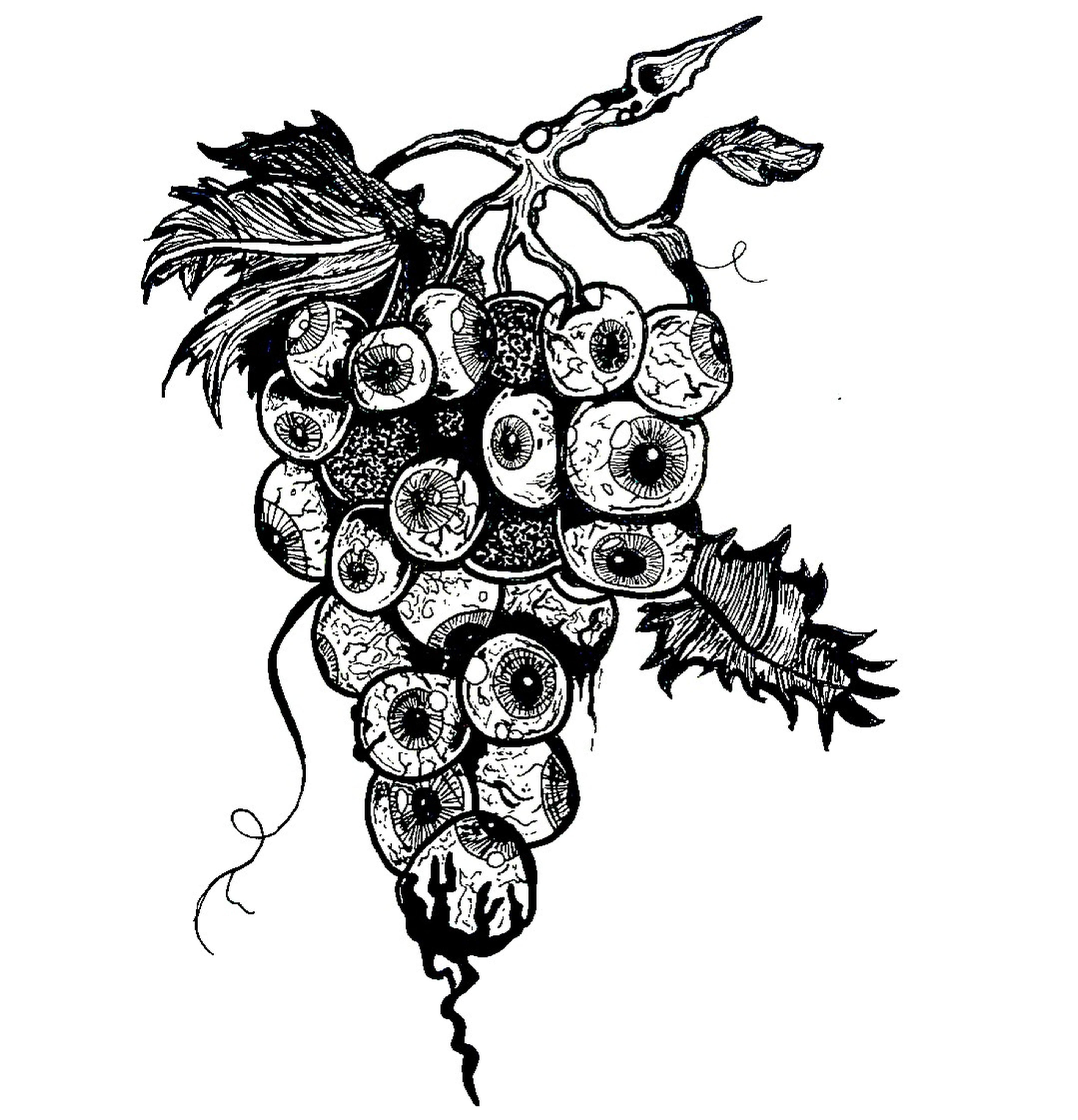Drawn entirely in black ink and sketch pen, this monochrome piece lures the viewer in with the familiar shape of a grape bunch—until you notice the horror tucked within the curves. Each grape is replaced by a detailed, unblinking eye, some wide in terror, others half-lidded in eerie calm. The veins of the stem twist like nerves, pulsing with silent life, anchoring the ocular harvest to a hauntingly realistic vine. There’s no blood, no gore—just a quiet, surreal dread. It feels like the eyes are not only watching you, but studying you, cataloguing your every blink. It's the kind of drawing you swear has shifted when you glance back.