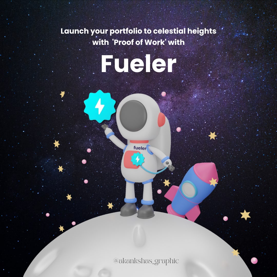 Caption: "Launch your portfolio to celestial heights with 'Proof of Work' 🚀🌕 Unlock your creative universe with Fueler, the ultimate platform for designers to build captivating portfolios that leave an indelible mark. 🎨✨ Your journey to the stars starts here. Join us today! #Fueler #ProofOfWork #DesignGalaxy"