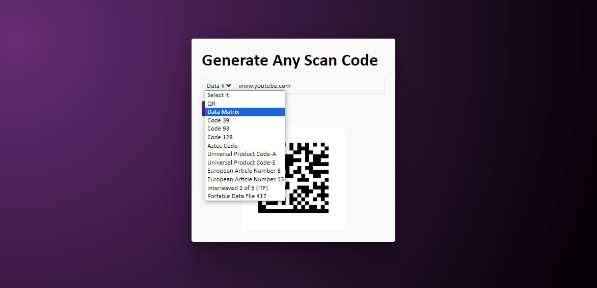Made with Html, Css, Javascript. simple way you can generate any type scan code which is mention in selection on the project. for full source code please contact me via instagram