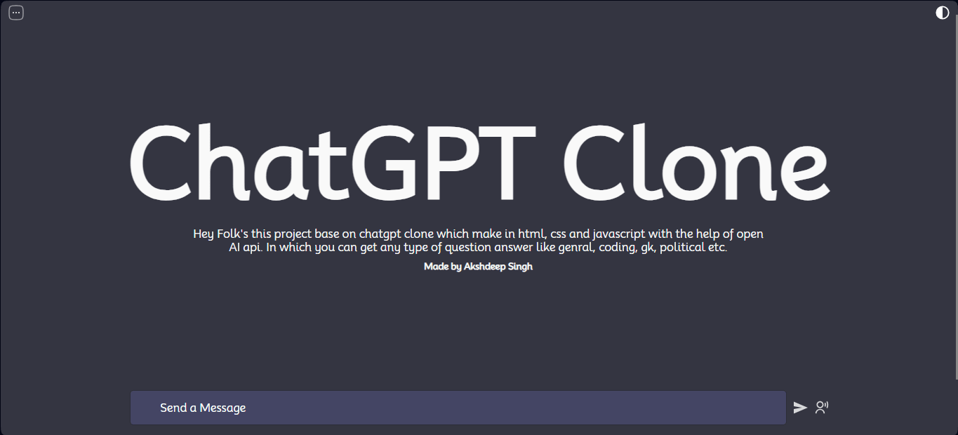 Hey Folk's hope you are doing well here its my new project which contain the chatgpt 3.5 api access and it capable to answer you question which you ask for open ai chat gpt 3.5. and this whole project made in html, css and vanilla javascirpt. for show you creativity with my project I also upload this project in my github profile which link is bleow ( www.github.com/akshdeep74644 ). where you can access my code and make you own chatgpt clone like my and show your creativity :) follow me on instragram for more porject with frontend dev