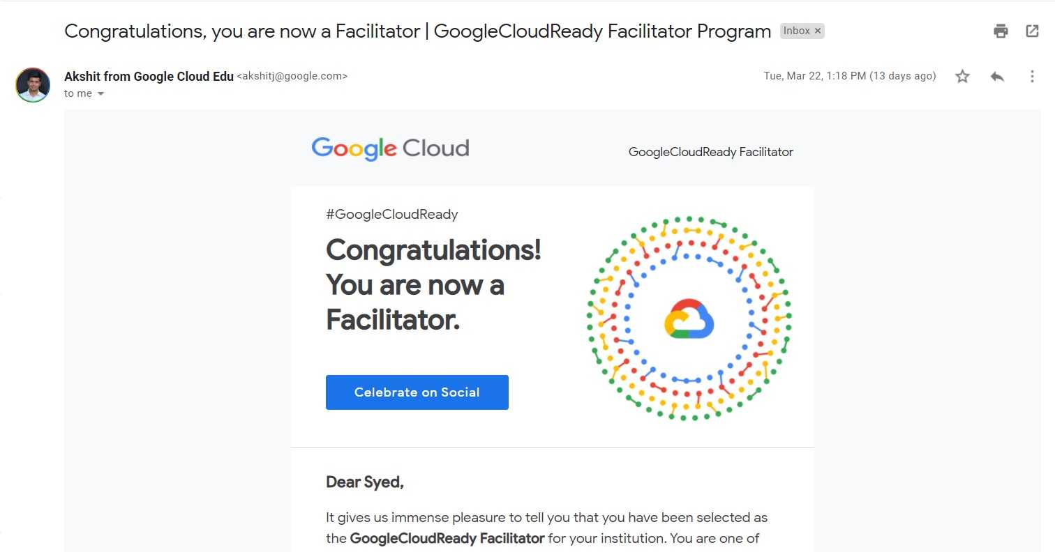 Selected as a Google Cloud Facilitator for "Google Cloud Ready" program for my institution (ISL Engineering College, Hyderabad).