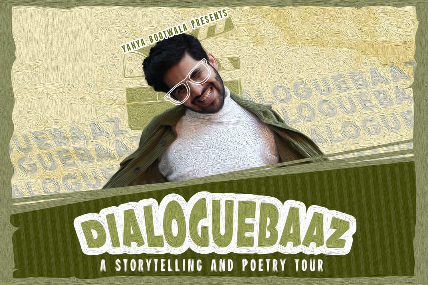 Design an emotionally resonant and visually striking Live Tour poster for Yahya Bootwala, a renowned poet and storyteller with 430K+ followers on social media, to promote his multi-city live shows under Oriole Entertainment X Tape A Tale banner. The goal was to reflect Yahya’s artistic depth while ensuring the poster grabbed attention across digital and physical spaces.