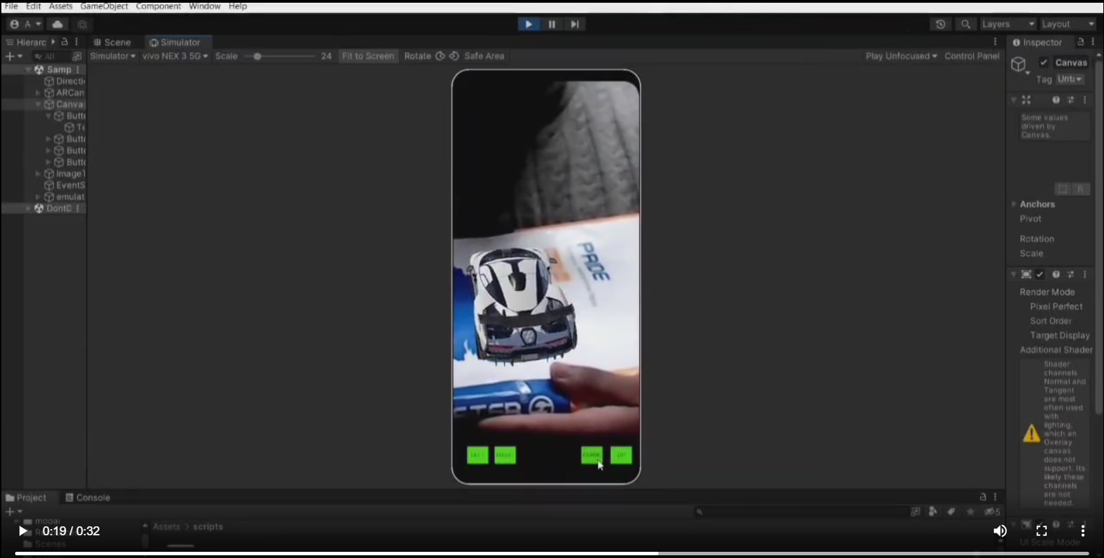 The AR CAR project is an augmented reality application that I developed using Unity and Vuforia. The application allows users to view a virtual car model overlaid onto the real world through their smartphone or tablet camera. To interact with the virtual car, I integrated Vuforia virtual buttons that users can tap on to trigger animations . The project was built using C# scripting, and involved creating 3D models and textures for the virtual car, as well as implementing the Vuforia SDK for image recognition and tracking. Overall, the AR CAR project was a great opportunity for me to develop my skills in Unity and AR development, and showcase my creativity and technical abilities in a real-world application.The AR CAR project is an augmented reality application that I developed using Unity and Vuforia. The application allows users to view a virtual car model overlaid onto the real world through their smartphone or tablet camera. To interact with the virtual car, I integrated Vuforia virtual buttons that users can tap on to trigger animations . The project was built using C# scripting, and involved creating 3D models and textures for the virtual car, as well as implementing the Vuforia SDK for image recognition and tracking. Overall, the AR CAR project was a great opportunity for me to develop my skills in Unity and AR development, and showcase my creativity and technical abilities in a real-world application.