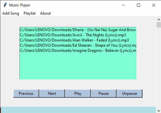 A music player built using Python and tkinter is a graphical user interface (GUI) program that allows users to play music files on their local computer. The program typically displays a list of available music files in a directory, which the user can select and play. The interface includes controls such as play, pause, stop, next and previous .