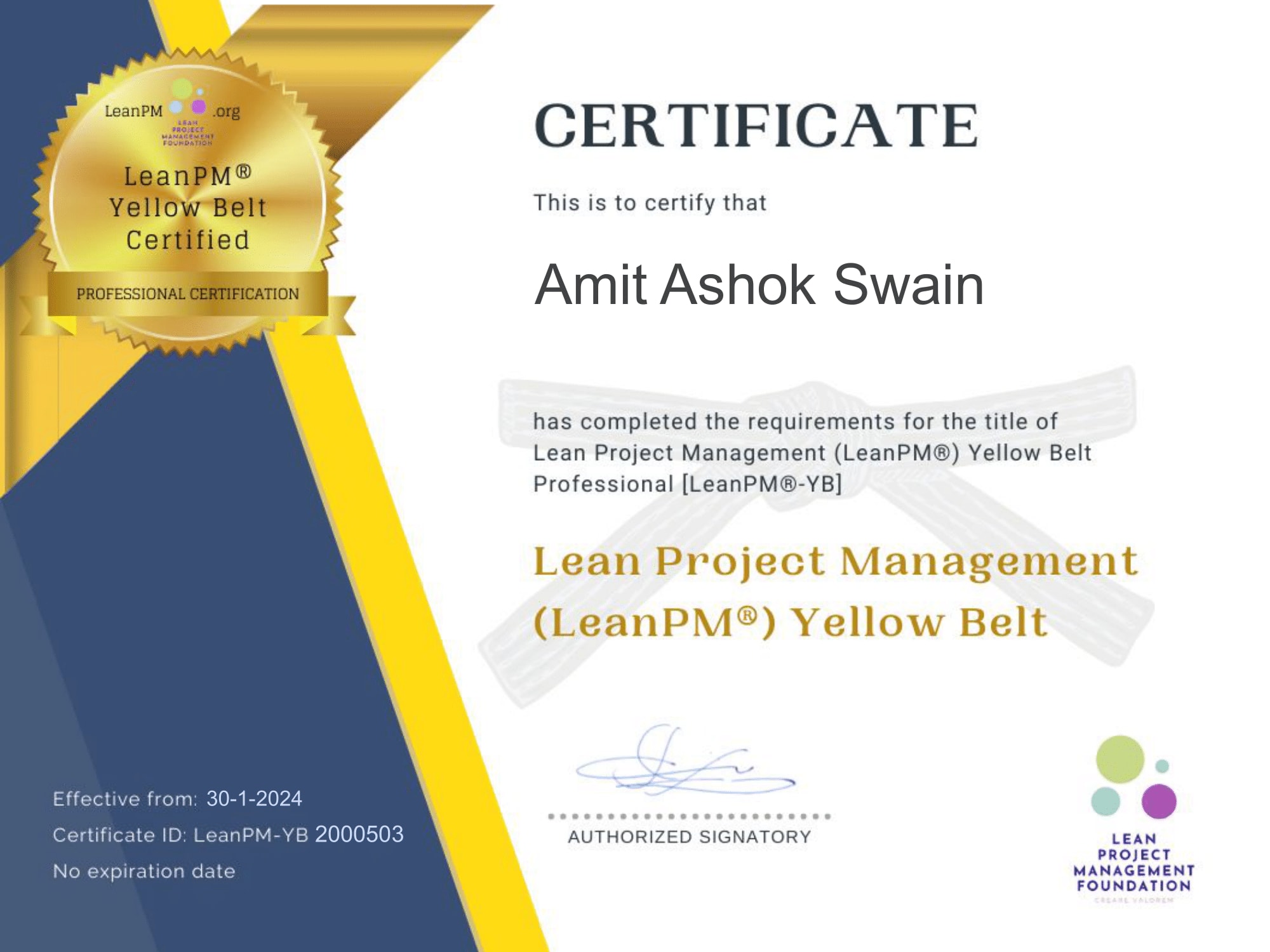 Through dedication and commitment, I have mastered the foundational concepts of Lean project management and successfully passed the LeanPM® Yellow Belt assessment. This achievement signifies my ability to apply Lean principles to project management processes, optimize workflows, and drive continuous improvement in project outcomes.