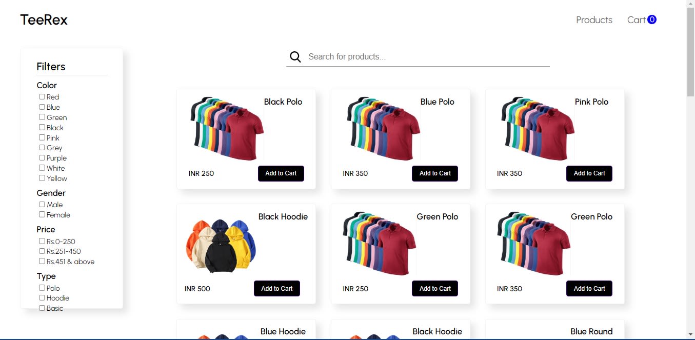 Using an API, we retrieved images, names, and prices of t-shirts from a product listing page. Implemented a search bar and filters for gender, color, price range, and type to help customers browse the catalog more easily.