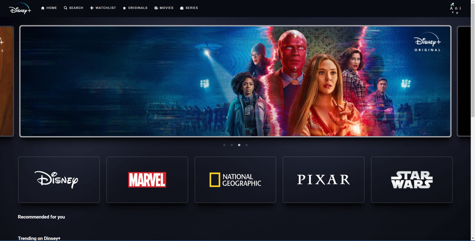 Disney+ homepage clone with React.js and other third-party libraries like Styled Components,.