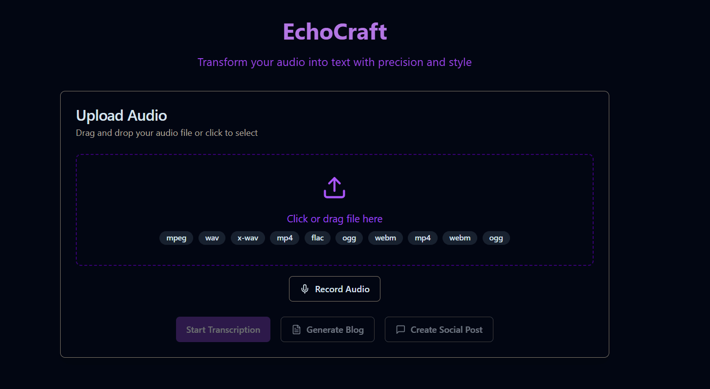 - Record or upload audio to transcribe speech into text.
