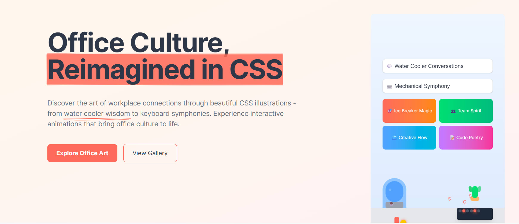 Discover the art of workplace connections through beautiful CSS illustrations - from water cooler wisdom to keyboard symphonies.
