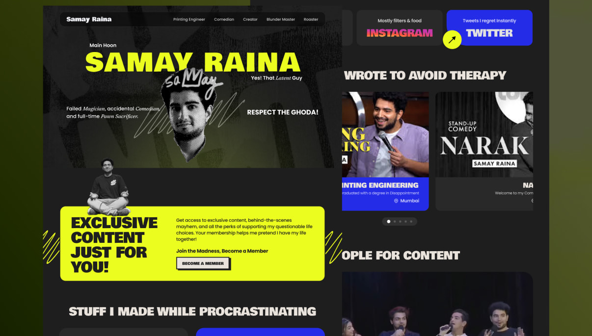 Create a modern, engaging, and humorous one-page website for Samay Raina, a popular Indian content creator and comedian. The website will reflect his unique personality, showcasing his content, live shows in a fun and interactive way.