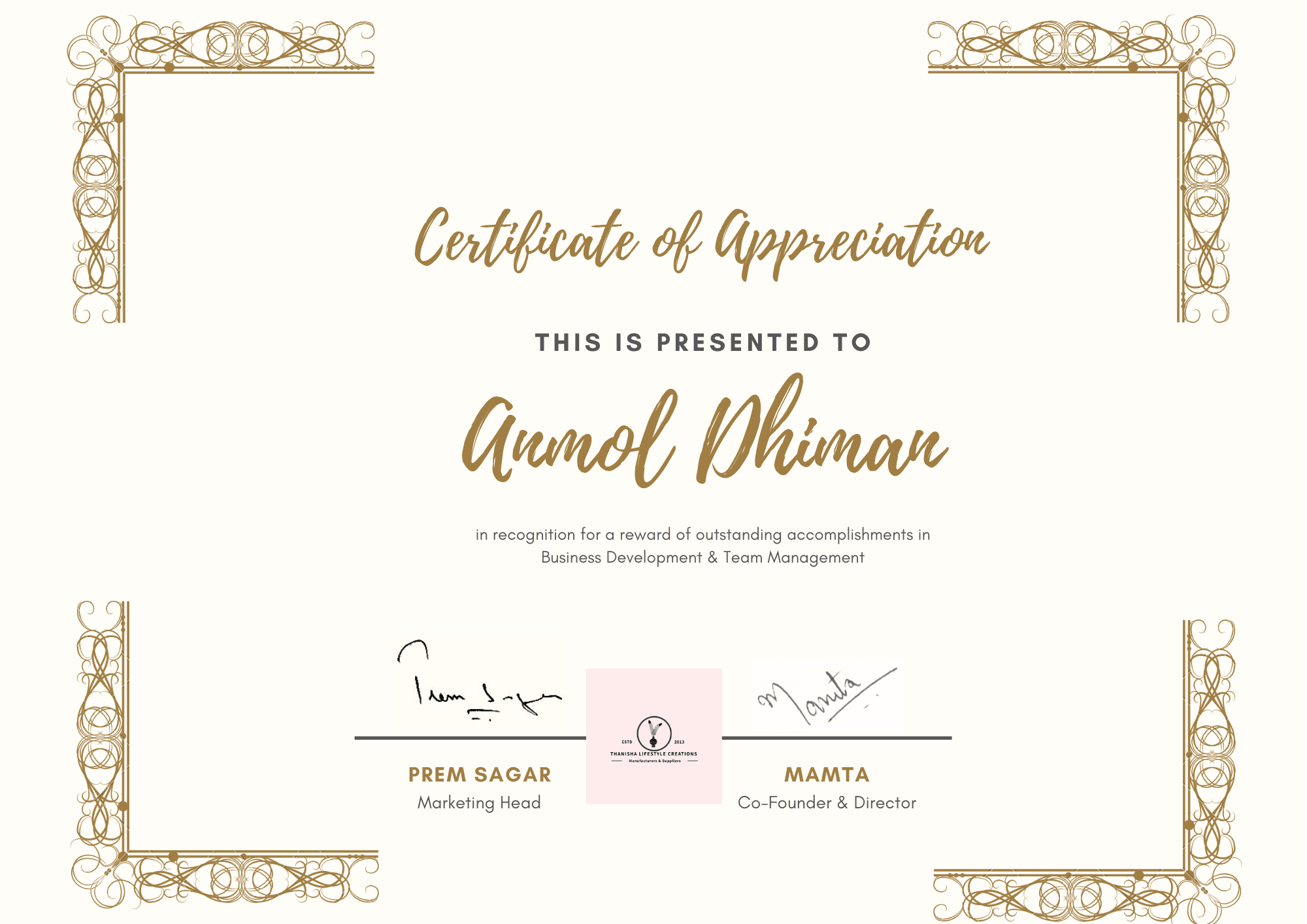 The appreciation certificate stands as a testament to my commitment, creativity, and impact during this role.