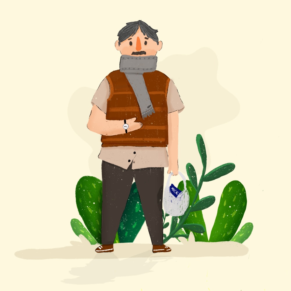 I had just woken up in the morning when I saw an uncle covered with his muffler and holding a packet of milk. Quickly grabbed my iPad and sketched a rough picture and later in the day completed it.