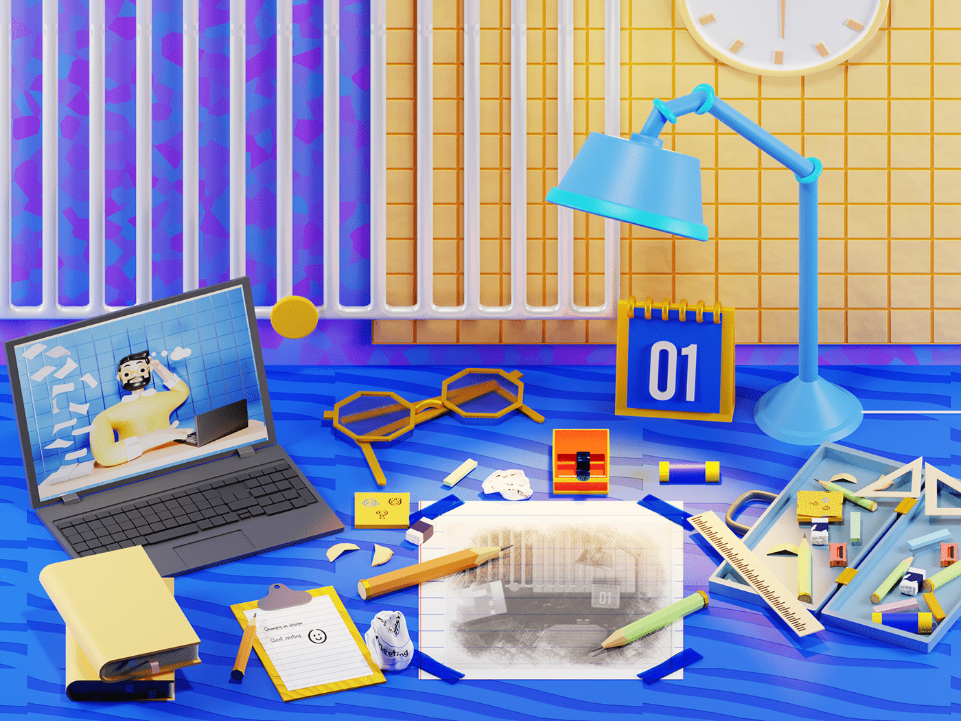 I have created a 3d illustration of a messy table of a designer.