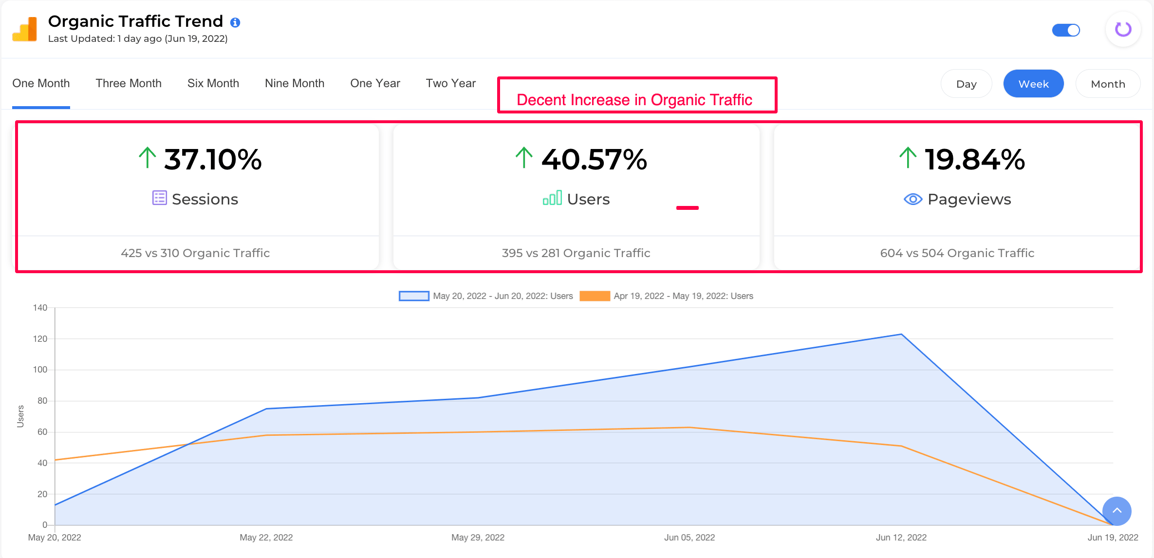 Showcasing a successful SEO campaign, resulted in a substantial growth of 40.57% in organic users and a 37.10% increase in sessions within a month.