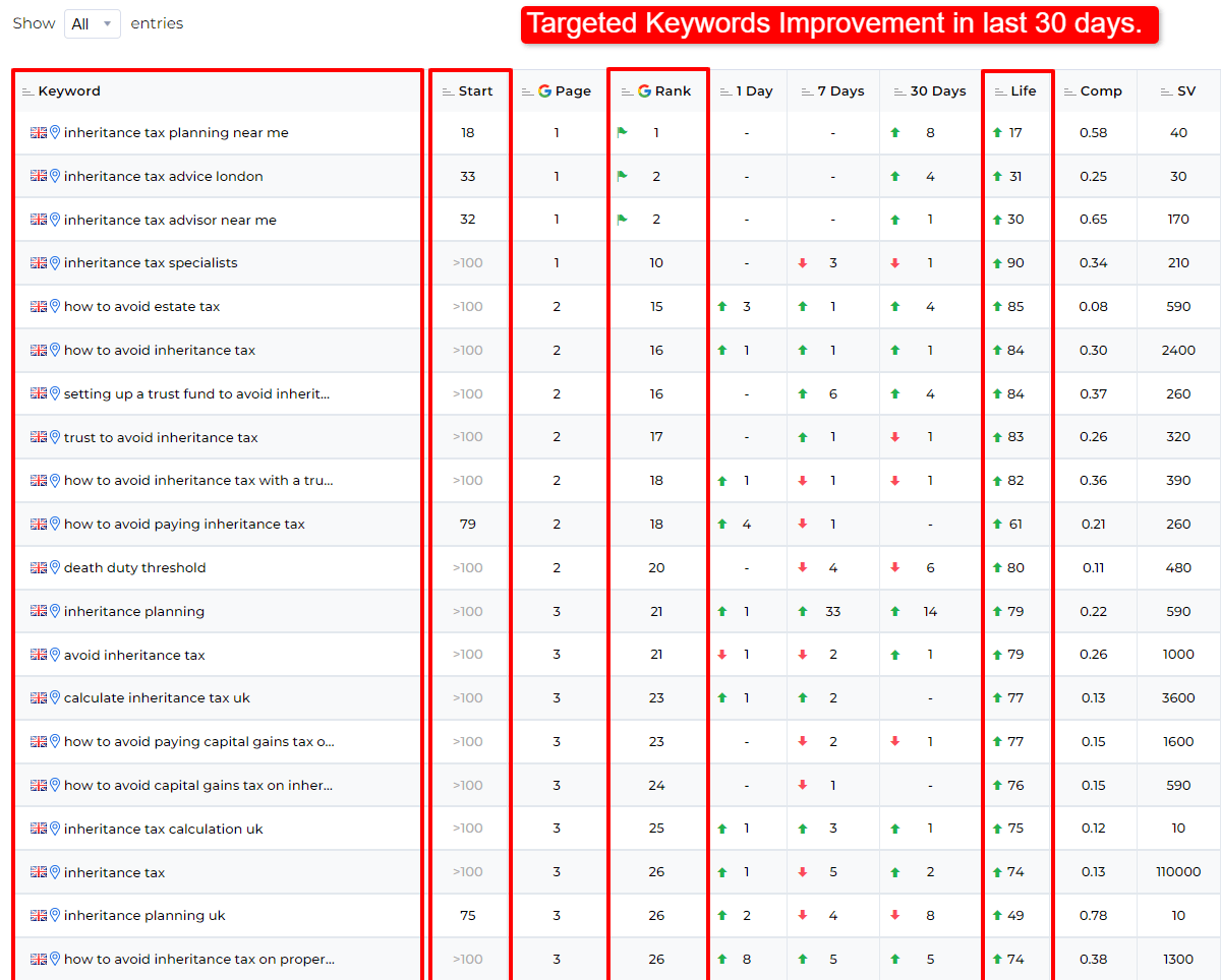 Through strategic keyword optimization and content enhancements, high-priority keywords like 'inheritance tax planning near me' and 'inheritance tax advice London' moved to the top Google rankings.