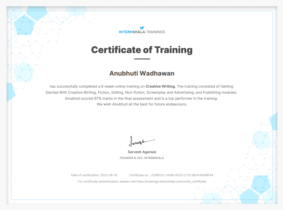 During this 6-week long course, I learnt Creative Writing, Fiction Writing, Editing, Non-fiction Writing, Screenplay and Advertising.
