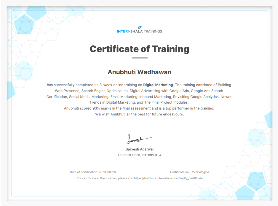 During this 8-week long course, I learnt Building Web Presence, Search Engine Optimisation, Digital Advertising with Google Ads, Social Media Marketing, Email Marketing, Inbound Marketing, Revisiting Google Analytics, Newer Trends in Digital Marketing.