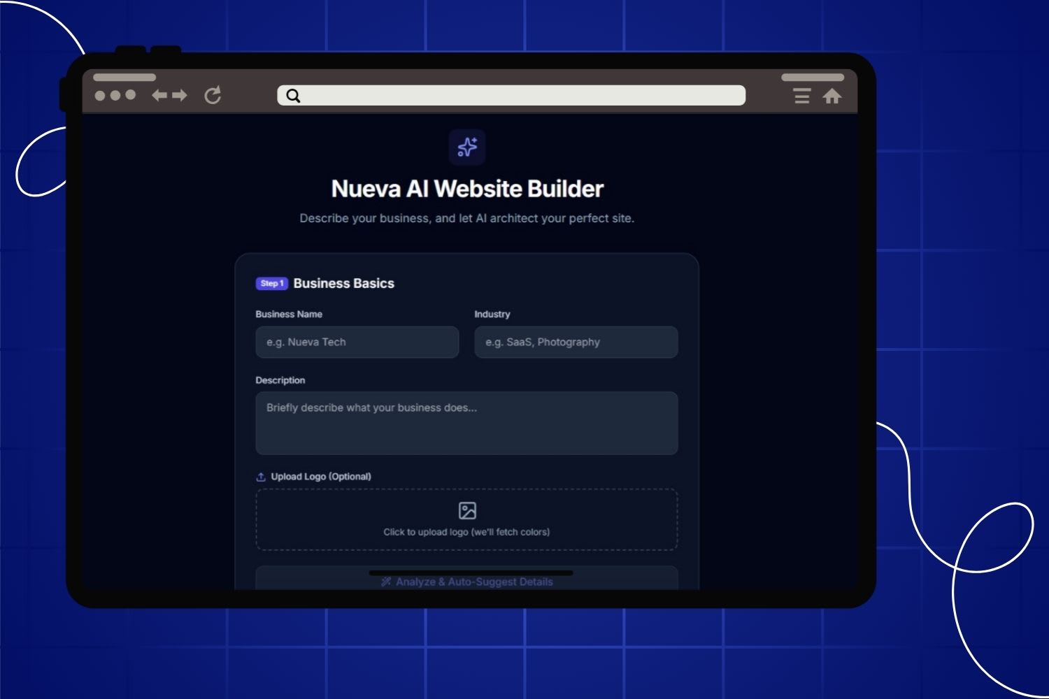 Nueva AI Website Builder is a custom-built AI application that automatically plans and generates static websites using HTML, CSS, and JavaScript based on minimal business input.