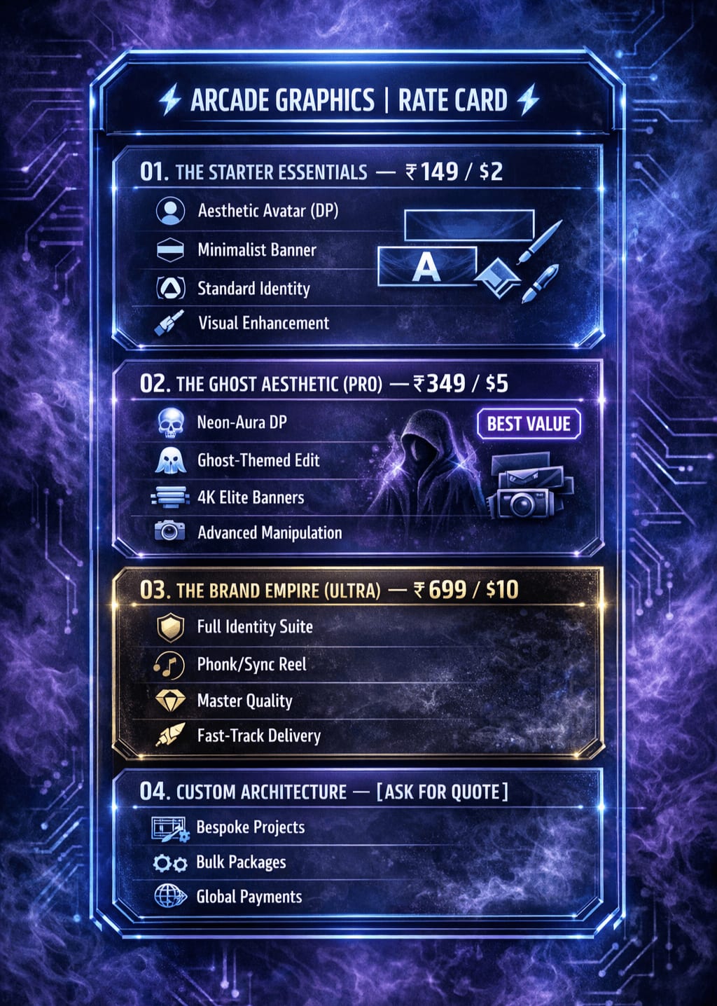 "Welcome to the future of visual storytelling. At Arcade Graphics, we don't just edit; we transform your identity. From our signature 'Ghost Aesthetic' and high-octane Phonk Reels to professional branding suites, we provide elite-level designs for creators and brands globally.
