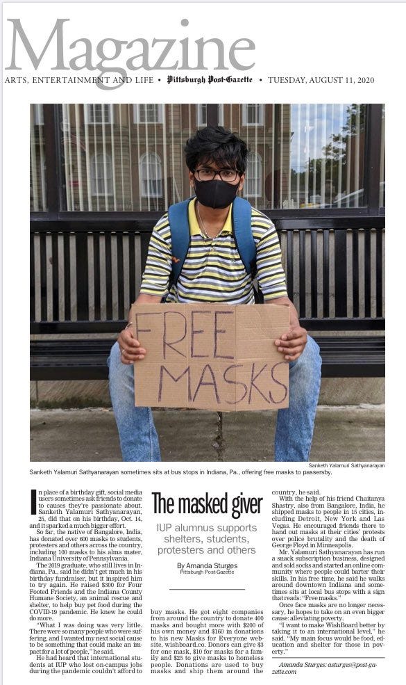 Today’s story about a guy, who has been recently featured on “facesofbengaluru”, he has distributed masks in 15+ cities in the US and India, supported 10k people in the time of Covid-19, started @wishboardco to help and support social causes.