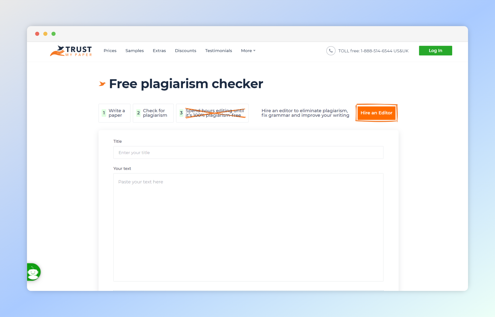 Trust My Paper allows you to check plagiarism from up to 10,000 characters in one go. You can also add the title of your written work to compare the uniqueness of the topic, as it's an important aspect of search engine optimization.