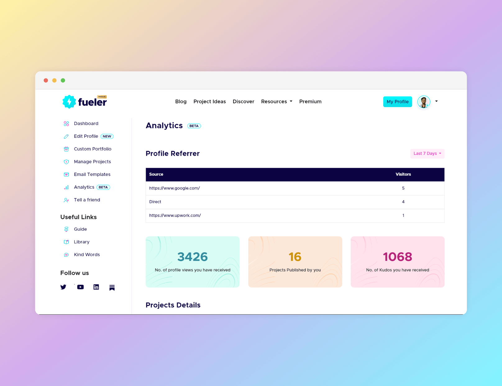 - We have upgraded the analytics feature for premium users, which includes a Total Profile Views block, Total Proof of Work Published, and Total Kudos received block. In addition, a project details section has been added, which lists all the projects along with their views and kudos received.