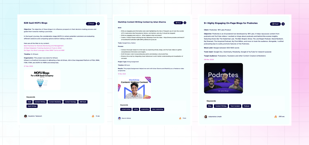 Fueler helps you organize your work into categories using custom portfolio. For example, you can create separate buckets for different services you offer, such as SEO, PPC, or social media management.