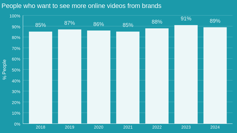 Video content has seen explosive growth in recent years, and it’s not slowing down. A study by Wyzowl found that 89% of consumers want to see more online video content from brands. Video engages senses—sight and sound—making it highly effective at quickly holding attention and conveying messages.