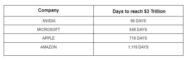 2024: Nvidia reached a $2 trillion market cap in February, then a $3 trillion market cap in just 96 days, surpassing Microsoft and Apple to become the most valuable company in the world.