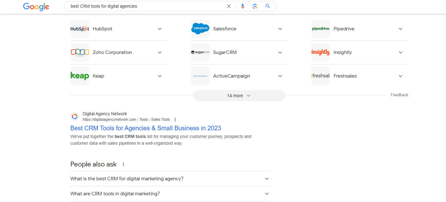 For example, if you're aiming to rank for the keyword "best CRM tools for digital agencies," a glance at the SERPs reveals that most of the top-ranking articles are blog posts in a listicle format that detail reviews and comparisons of various CRM tools, specifically focusing on the most recent, up-to-date offerings for the year 2023.