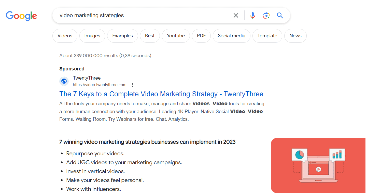 For example, if your agency specializes in video marketing and you're targeting the keyword "video marketing strategies," then you need to delve deep into each strategy, bolster it with relevant stats, and back it up with real-world examples to cement your content as the most comprehensive source for the topic.