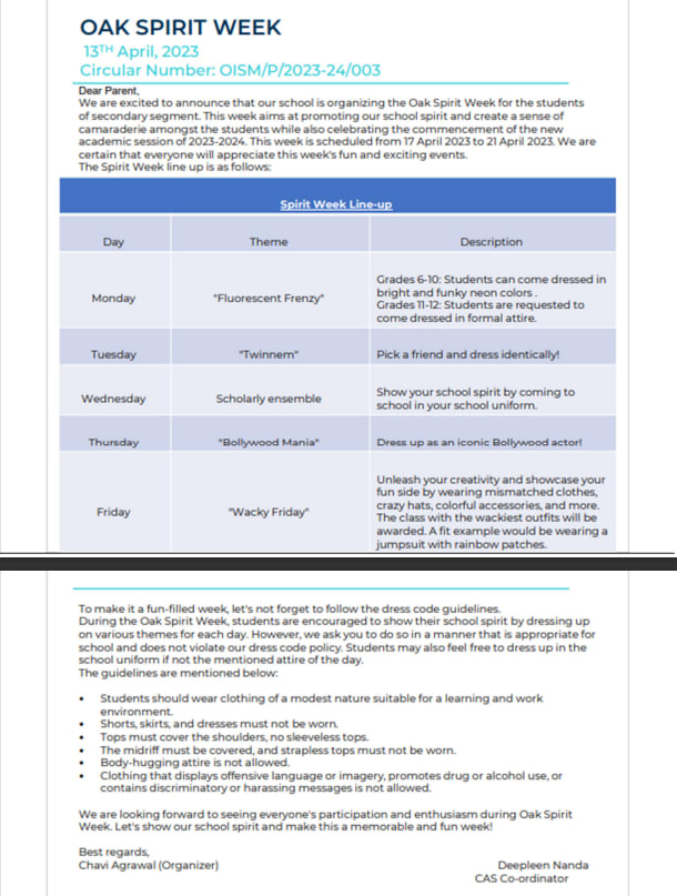 This is the 1st circular that announces the Oak Spirit Week and includes the line up as well as the dress code.