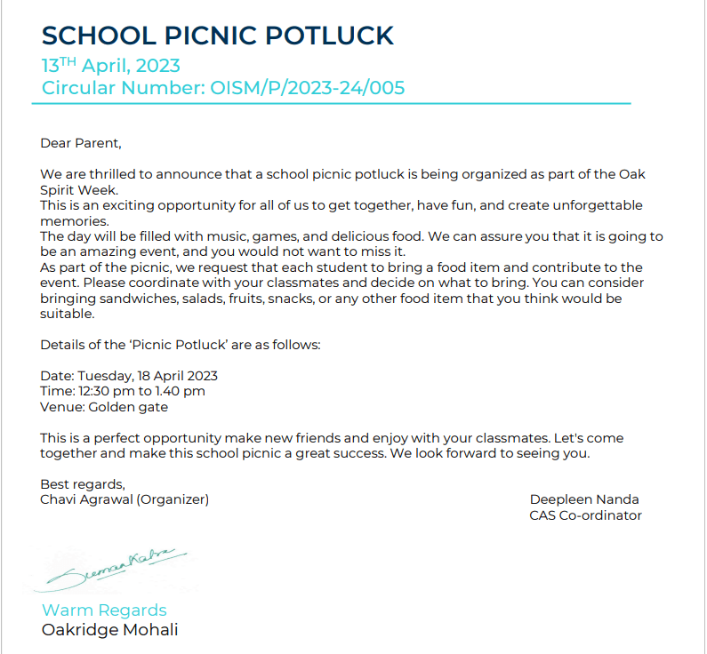 This is the circular that announces the event that is to take place on the 2nd day of the Oak Spirit Week, The school picnic. There will be food, music, laughter, and surprise performances.
