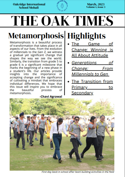The Oak Times is thrilled to unveil its highly anticipated third issue, an embodiment of the transformative theme, "Metamorphosis." As the Founder and President of The Journalism Club and Editor-in-Chief of our publication, I am overjoyed to share this momentous occasion with our readers. In this edition, we delve into the profound beauty and significance of change, exploring how it permeates various aspects of our lives. From the evolution of generations to the transitions between grades, and the embracing of individual differences, our aim is to ignite inspiration within our readers, fostering an appreciation for the extraordinary process of transformation.