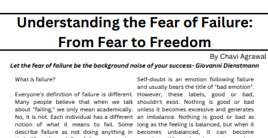 In the second issue of The Oak Times, I wrote an article in which I delved into the concept of the fear of failure, examining its definition and exploring the range of emotions that can be associated with it, including anxiety and self-doubt. Drawing from my own experiences, I explained how fear can actually be a powerful motivator and provided insights into the different working mechanisms that can be used to harness this emotion. Finally, I explored the idea of shifting from a mindset dominated by fear to one that prioritizes freedom and personal growth.
