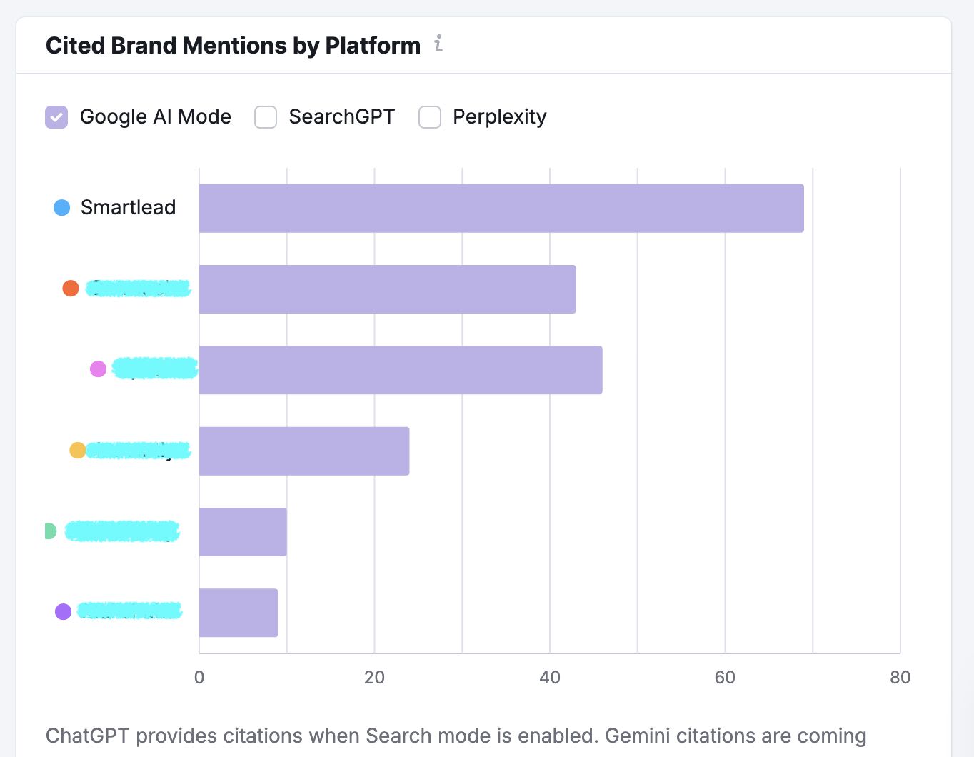 Tracked cited brand mentions across ChatGPT, Perplexity, Gemini, and SearchGPT.