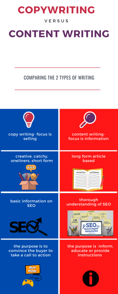 Copywriting persuades readers to take an action (CTA) whereas content writing educates and informs the audience through blogs, articles