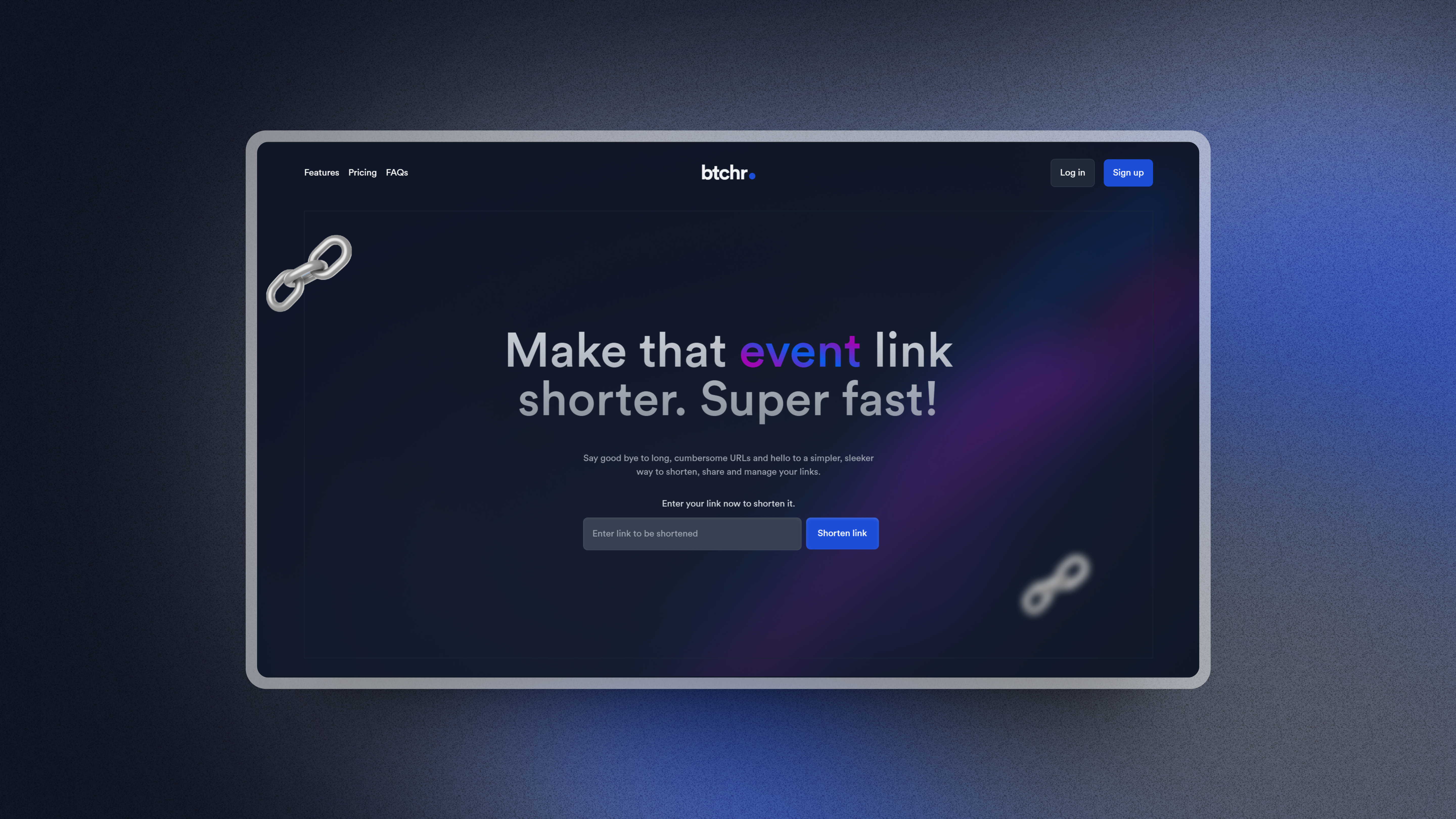 btchr, a link shortening application to help you shorten your long links. You have access to analytics like click counts, locations and click sources. btchr is free today, shorten links today!